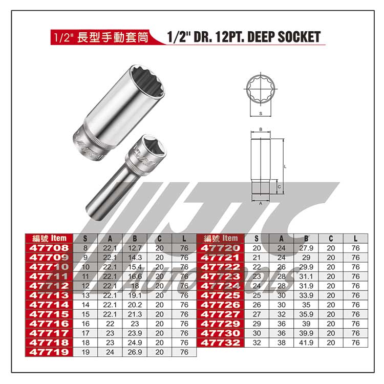 1/2" 手动长12角套筒8mmJTC47709